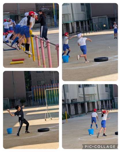 校庭では体力テストが行われていました。先生のお手本を見て、高く遠くにボールを投げます。