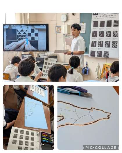 彫刻刀の使い方について学んでいました。それぞれが描いた生き物の下絵を机の上に置いていました。彫刻刀の、使い方を学んでから制作に入ります。