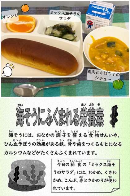 今日の献立は、鶏肉とかぼちゃのシチュー、ミックス海そうサラダ、オレンジ、パンプキンパン、牛乳です。