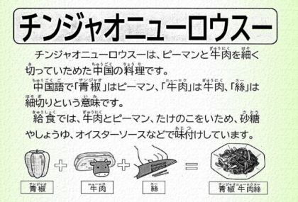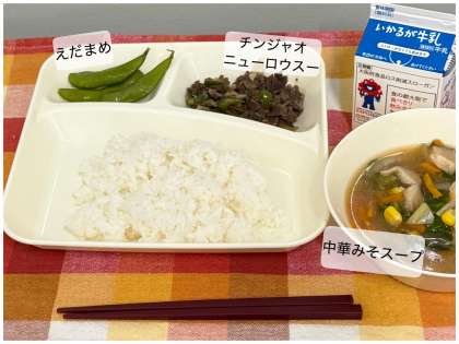 今日の献立は、チンジャオニューロウスー、中華みそスープ、えだまめ、ごはん、 牛乳です。