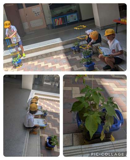 自分で育てた朝顔の観察をしています。もうすぐ花が咲くかな。