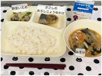 今日の献立は、さごしのおろしじょうゆかけ、 みそ汁、野菜いため、ごはん、牛乳です。