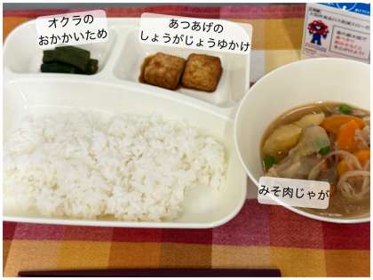 今日の献立は、みそ肉じゃが、あつあげのしょうがじょうゆかけ、オクラのおかかいため、ごはん、 牛乳です。