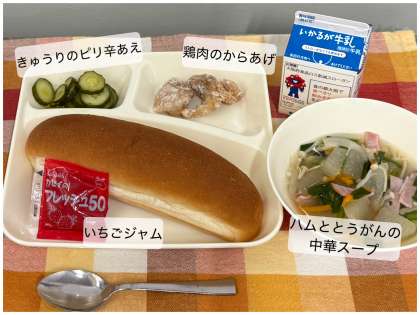 今日の献立は、鶏肉のからあげ、ハムととうがんの中華スープ、きゅうりのピリ辛あえ、コッペパン、いちごジャム、牛乳です。