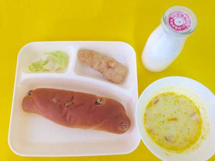 【サーモンフライ、豆乳コーンスープ、キャベツのソテー、レーズンパン、牛乳】