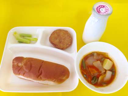 【チキンレバーカツ、ケチャップ煮、グリーンアスパラガスのサラダ、レーズンパン、牛乳】