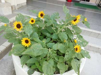 職員室前の植木鉢です。淀川区からいただいたミニヒマワリが元気に咲いています。