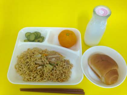 【焼きそば、きゅうの辛みづけ、みかん(冷)、黒糖パン1/2、牛乳】