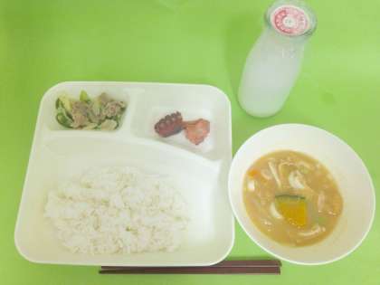 【たこのやわらか煮、みそ汁、野菜いため、ごはん、牛乳】