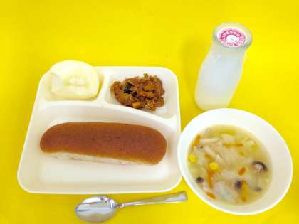 【なすのミートグラタン、鶏肉と野菜のスープ、りんご、ライ麦パン、牛乳】