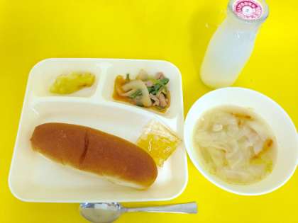 【豚肉と野菜のケチャップソテー、スープ、スイートポテト、大型コッペパン、マーマレード、牛乳】