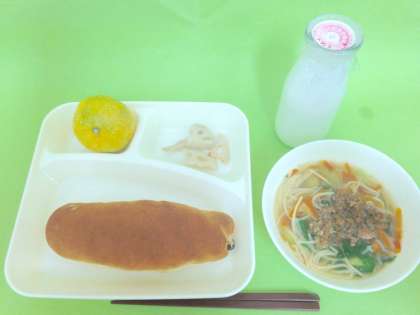 【タンタンめん、れんこんのオイスターソース焼き、みかん、レーズンパン、牛乳】