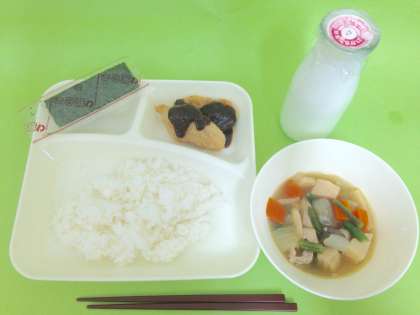 【みそカツ、鶏肉と野菜の煮もの、焼きのり、ごはん、牛乳】