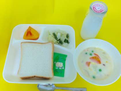【コーンクリームシチュー[米粉]、キャベツと三度豆のサラダ、かき(平核無柿)、食パン、ソフトマーガリン、牛乳】