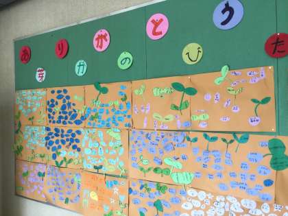 1学期のありがとう週間でありがとうの種を作り、1週間親切の心を持ち、ありがとうの言葉を大切に過ごしました。その様子を見て、代表委員の子ども達が芽を作って伸ばしています。いつかありがとうの花が咲くはずです。花が咲く日が楽しみです。
