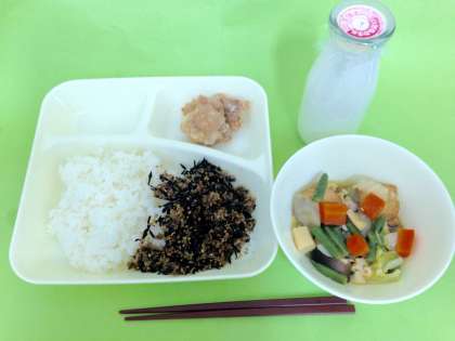 【鶏肉のたつたあげ、あつあげと野菜の煮もの、おかかひじき、ごはん、牛乳】