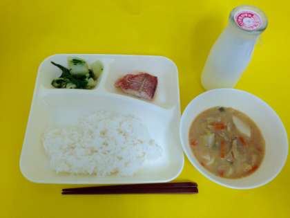 【赤魚のしょうゆだれかけ、みそ汁、おおさかしろなのごまあえ、ごはん、牛乳】