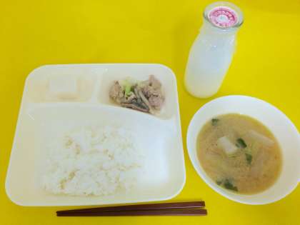 【豚肉とまいたけのいためもの、つみれ汁、ういろう、ごはん、牛乳】