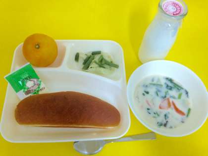 【きのこのクリームシチュー、キャベツと三度豆のサラダ、みかん、大型コッペパン、ソフトマーガリン、牛乳】