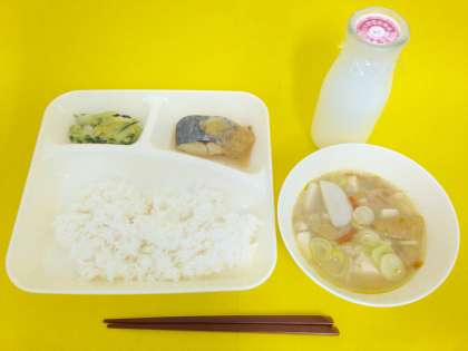 【さごしのおろしじょうゆかけ、けんちん汁、はくさいのおひたし、ごはん、牛乳】