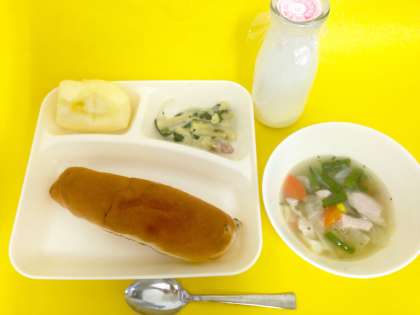 【鶏肉と野菜のスープ煮、ほうれん草のグラタン、りんご、レーズンパン、牛乳】
