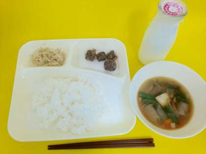 【くじらのたつたあげ、さといもと野菜の煮もの、もやしのゆずの香あえ、ごはん、牛乳】