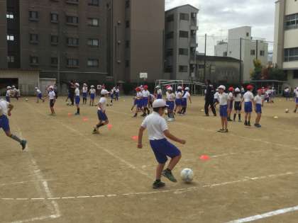 4年生の児童対象に、セレッソからサッカーのコーチが4名来校されました。2時間目は基礎練習、3時間目はゲームと盛りだくさんの内容でした。2時間しっかり体を動かし、最後はコーチ対児童でスペシャルゲームも行い、子ども達も充実した様子でした。