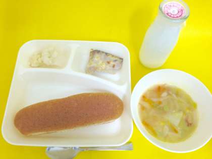 【かつおのガーリックマヨネーズ焼き、マカロニと野菜のスープ、カリフラワーのサラダ、ライ麦パン、牛乳】