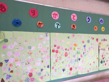 この実は「ありがとう」の言葉をたくさん言った子、言われた子が自主的に実を作って貼っています。