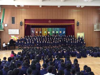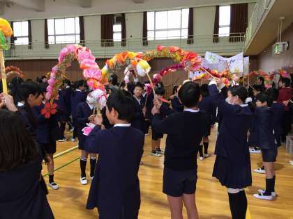 6年生からは歌やダンス、雑巾等を在校生にプレゼントしました。雑巾は家庭科の時間を使い、6年生が手縫いで作った飾り付きの物です。学校をきれいにしてくれるように、掃除が楽しくできるようにと気持ちをこめて縫っています。