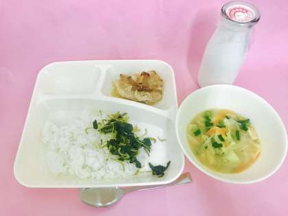 【豚肉のしょうが焼き、みそ汁、じゃこわかめ、ごはん、牛乳】
