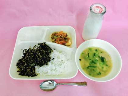 【さけの野菜たっぷりあんかけ、みそ汁、まぜまぜふりかけ、ごはん、牛乳】