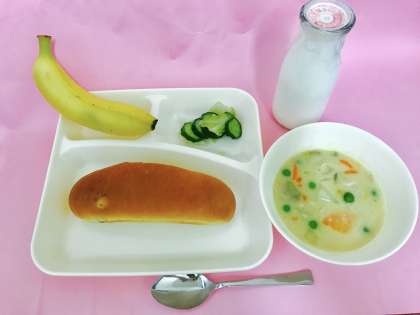【コーンクリームシチュー、グリーンサラダ、バナナ、レーズンパン、牛乳】