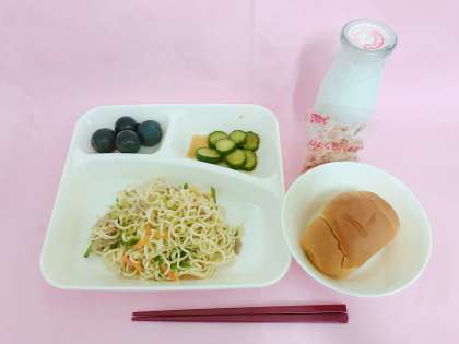 【和風焼きそば、きゅうりの辛みづけ、ぶどう(巨峰)、黒糖パン1/2、牛乳】