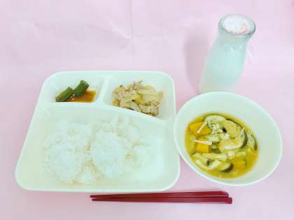 【豚肉の甘辛焼き、みそ汁、オクラのおかかいため、ごはん、牛乳】