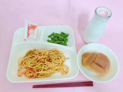 【イタリアンスパゲッティ、グリーンアスパラガスのサラダ[ノンエッグドレッシング]、黒糖パン1/2、牛乳】