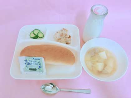 【鶏肉のマリネ焼き[ノンエッグドレッシング、スープ煮、きゅうりのピクルス、大形コッペパン、ブルーベリージャム、牛乳】