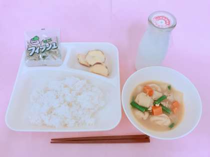 【豚肉と一口がんもの煮もの、さつまいものてんぷら、ミニフィッシュ、ごはん、牛乳】