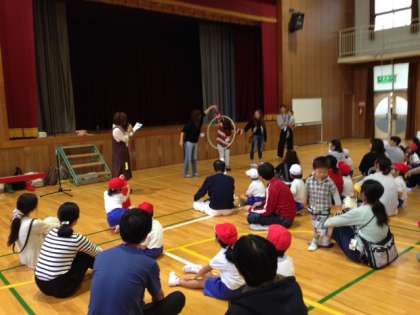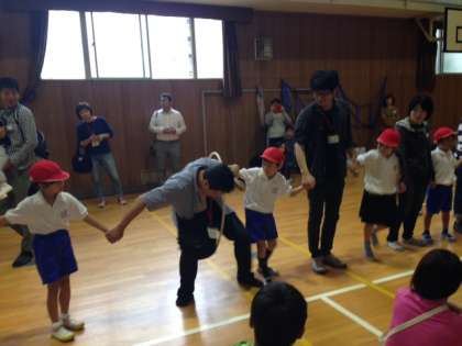 2時間目に家族ふれあい会がひらかれました。1年生の学級委員さんが中心となって、フラフープくぐりと、ボール送りのゲームをしました。