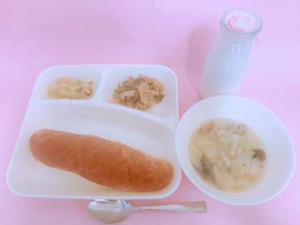 【豚肉と野菜のケチャップソテー、スープ、スイートポテト、レーズンパン、牛乳】
