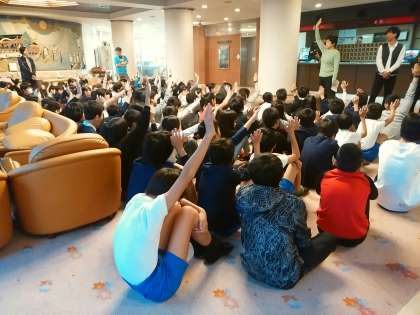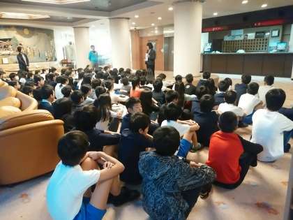 全員そろって朝の会をしました。雨のため、ロビーでしました。集合もよく、静かに話を聞いていました。