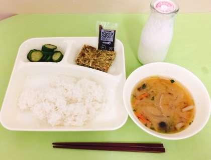 【お好み焼き、豚汁、きゅうりの梅風味、ごはん、牛乳】