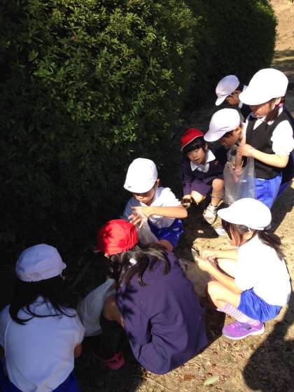 1年生の子ども達は袋をもって、ドングリを探します。落ち葉の中にかくれているドングリを見つけると、「あった♪」と嬉しそうに指をさして拾っていました。細長いドングリや丸いドングリ、松ぼっくりなどをたくさん持って帰ることができました。