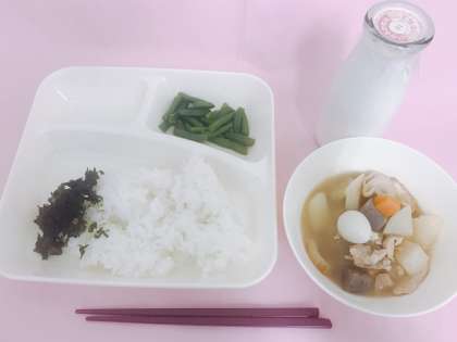 【関東煮、三度豆のからしあえ、のりのつくだ煮、ごはん、牛乳】