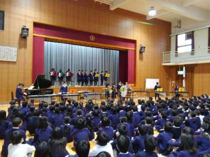 児童集会の時間にミュージッククラブは、「さんぽ」「となりのトトロ」「友よ〜この先もずっと…」の3曲を披露しました。講堂に集まった全校児童は、息の合った演奏に聞き入っていました。