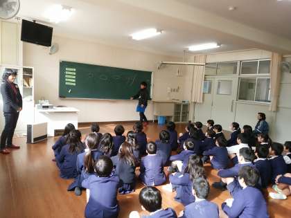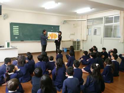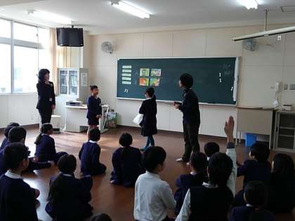 来年度から、3年生以上で外国語活動の授業がおこなわれます。担任が日本語を使わずに、1時間の英語の授業をする研修を行いました。3年生の子どもたちは、あいさつや英会話の劇、絵本の英語のフレーズを楽しんで声に出していました。