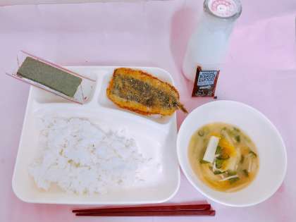 【いわしのフライ、みそ汁、焼きのり、ごはん、牛乳】