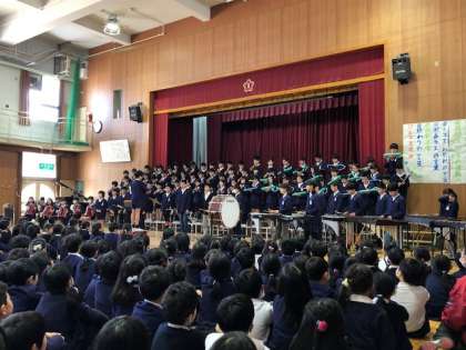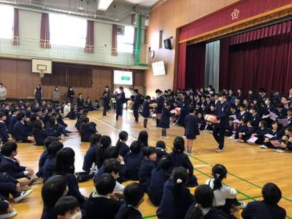 1年生から5年生までの在校生が、学年ごとに歌や合奏などのお祝いの出しものを贈り、たてわり班でつくった写真入りの色紙をプレゼントすると、6年生からは、ぞうきんの贈呈とお別れの言葉、合奏のお返しがありました。各学年の心のこもった音楽や立派に成長した6年生の見事な姿に、教職員も感慨無量の面持ちでした。
