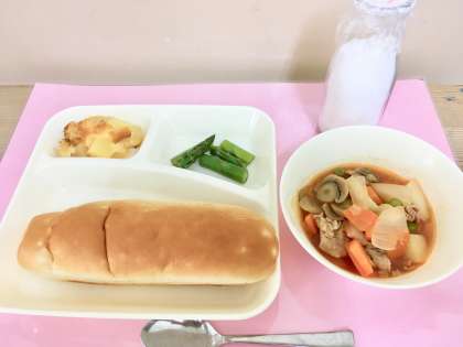 【おさつパン、ケチャップ煮、グリーンアスパラガスのサラダ、りんごのクラフティ】
