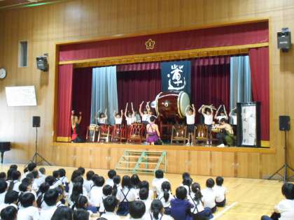 鑑賞会の最後には、各クラスからの代表が舞台に上がって、太鼓の演奏体験コーナーがありました。「せーのっ!」という掛け声に合わせて、ドンドンドンと息の合った太鼓の音が講堂いっぱいに響きました。